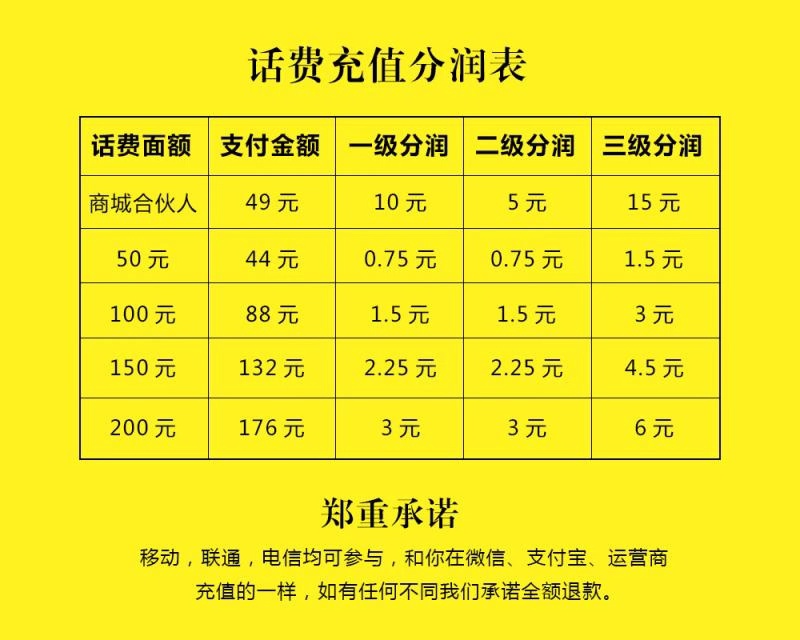 我們充值話費(fèi)的面額,從50元開始。50元,我們需要支付44元。我們可以拿到一級(jí)的0.75元的一個(gè)分潤(rùn),二級(jí)0.75的一個(gè)分潤(rùn),三級(jí)1.5元的一個(gè)分潤(rùn)。充值100元,支付88元我們可以拿到一級(jí)1.5元的分潤(rùn),二級(jí)1.5元的分潤(rùn),三級(jí)三元的一個(gè)分潤(rùn)。充值150元話費(fèi)的面額支付132元,可以拿一級(jí)。2.25的一個(gè)分潤(rùn)??梢阅枚?jí),2.25的一個(gè)分潤(rùn)。可以拿三級(jí)4.5的一個(gè)分潤(rùn)。話費(fèi)面額充值200元,只需要支付176元,可以拿一級(jí)分潤(rùn),3元二級(jí)分潤(rùn)3元。三級(jí)分潤(rùn)6元。zn1菜譜美食網(wǎng)-眾歸云 - 24小時(shí)不關(guān)機(jī)的云端電腦_云主機(jī)_VPS掛機(jī)寶_免費(fèi)掛機(jī)寶_0.1元試用,3-5元月租服務(wù)器提供