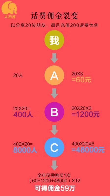 B又推廣了C,都是按照層層裂變,每人推廣20個(gè)人來計(jì)算,400乘以20等于8000人,400乘20再乘以6元的話費(fèi)傭金分潤(rùn)來計(jì)算是48000元,我們推廣的人充值話費(fèi),全年僅需購(gòu)買一次,就可以獲得59萬的傭金。zn1菜譜美食網(wǎng)-眾歸云 - 24小時(shí)不關(guān)機(jī)的云端電腦_云主機(jī)_VPS掛機(jī)寶_免費(fèi)掛機(jī)寶_0.1元試用,3-5元月租服務(wù)器提供