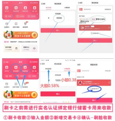2、選擇移動收款或者刷臉收款都可以,選擇之后輸入金額,新增交易卡,然后確認(rèn)移動收款或者刷臉收款就可以了。如下圖所示:
