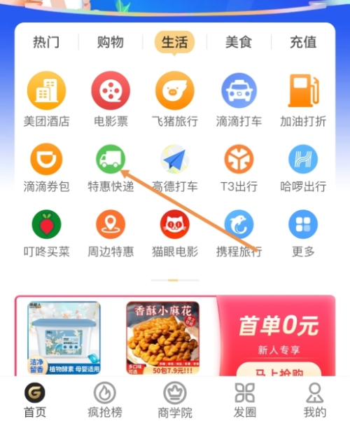 1 登錄果凍寶盒后,在首頁找到生活一欄,然后點擊特惠快遞