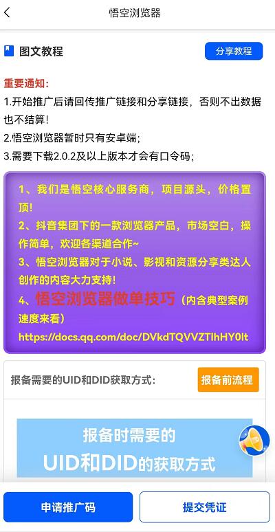 注冊之后,我們首頁置頂項(xiàng)目就可以找到【悟空瀏覽器】,然后點(diǎn)擊申請報(bào)備,注意報(bào)備成功之后,所謂的推廣碼就是我們專輯的分享鏈接和口令,要通過之后才有拉新收益,具體操作流程和注意事項(xiàng)包括案例,平臺(tái)任務(wù)里都會(huì)有說明。IrZ菜譜美食網(wǎng)-眾歸云 - 24小時(shí)不關(guān)機(jī)的云端電腦_云主機(jī)_VPS掛機(jī)寶_免費(fèi)掛機(jī)寶_0.1元試用,3-5元月租服務(wù)器提供
