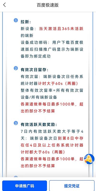 百度極速版是百度公司出品,雖然獎(jiǎng)勵(lì)力度很大,但也是有一定的要求的,目前的話百度極速版推廣必須要有次留,然后最好可以做7天4留(就是7天里起碼活躍4天),留存比例越高獎(jiǎng)勵(lì)也會(huì)越高。RGP菜譜美食網(wǎng)-眾歸云 - 24小時(shí)不關(guān)機(jī)的云端電腦_云主機(jī)_VPS掛機(jī)寶_免費(fèi)掛機(jī)寶_0.1元試用,3-5元月租服務(wù)器提供