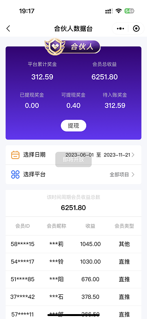 另外在整個(gè)一峰團(tuán)隊(duì)收益中,下級(jí)會(huì)員的總收益也達(dá)到了6251了,這次先記錄在這里,看看下次又隔一段時(shí)間,這個(gè)收益是多少,像上次我記錄一樣,拭目以待。