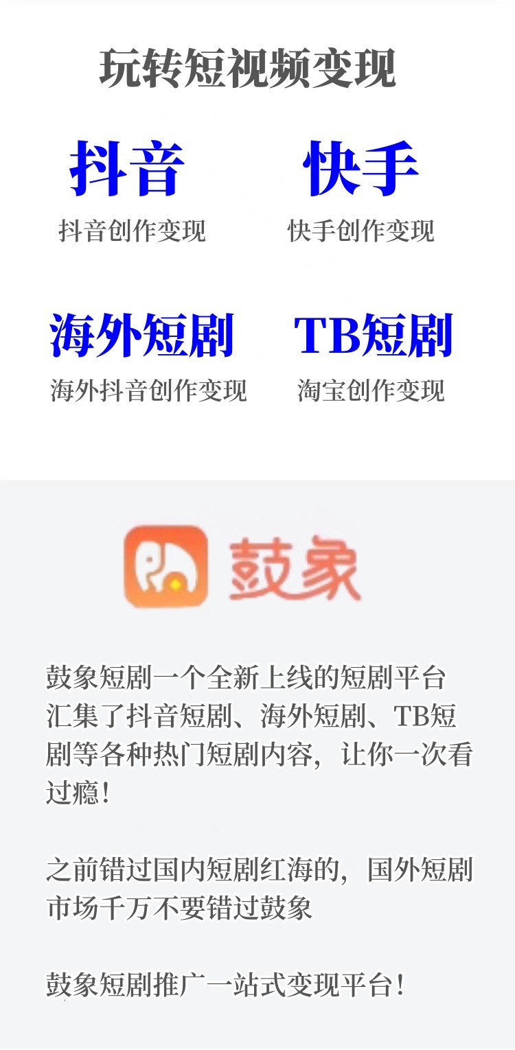 鼓象短劇最新,是一個(gè)新上線的短劇平臺,里面有抖音短劇、海外短劇、TB短劇等各種熱門短劇,想做哪個(gè)平臺就做哪個(gè),讓你一次看個(gè)夠!而且,我們還提供了掙米的機(jī)會!