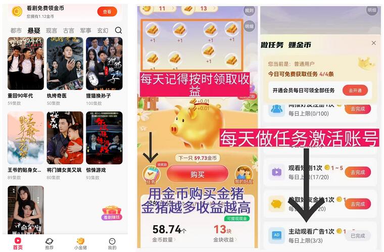 其實這個項目操作還是很簡單的,雖然名字叫短劇,首頁也確實有一些短劇提供給大家觀看,不過整體而言其實關聯(lián)不大,我首次下載軟件公司會贈送600金幣,這些金幣是不能直接體線的,可以兌換10只金豬,每天看廣告和短劇,產(chǎn)出金塊240個等于2塊錢,月利潤60塊錢。