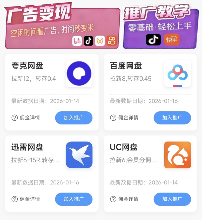 網(wǎng)盤拉新靠譜的平臺(tái)選擇,目前市面上知名度比較高的拉新平臺(tái)之一有夸推班,但是實(shí)測(cè)下來,我個(gè)人感覺不錯(cuò),優(yōu)點(diǎn)就是項(xiàng)目眾多,網(wǎng)盤拉新的資源還是比較多的。