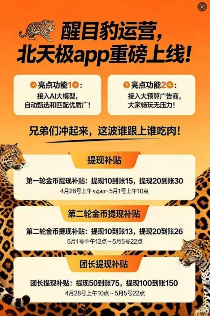 北天極最新上線:開啟廣告AI智能零擼新模式,在當(dāng)今數(shù)字化浪潮中,各類創(chuàng)新型掙米模式如雨后春筍般涌現(xiàn),而北天極作為醒目豹旗下的廣告零擼平臺(tái),以其獨(dú)特的AI智能賦能和強(qiáng)大的優(yōu)勢,在眾多平臺(tái)中脫穎而出,最新上線便吸引了無數(shù)目光,為廣大用戶帶來了一場前所未有的全新體驗(yàn)。bTi菜譜美食網(wǎng)-眾歸云 - 24小時(shí)不關(guān)機(jī)的云端電腦_云主機(jī)_VPS掛機(jī)寶_免費(fèi)掛機(jī)寶_0.1元試用,3-5元月租服務(wù)器提供